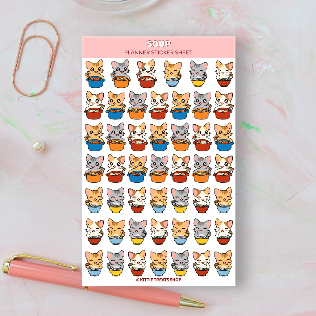 Are you a true devotee of all things broth, noodle, and creamy? Do you have a favorite day of the week for a big bowl of bisque? Then these are the stickers for you! Designed with a delightful and quirky cat-and-soup theme, this pack is purr-fect for chronicling your soup-related passions.